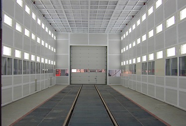 室體主材料 烘道骨架的立柱、橫梁采用□120×120×5方管制作,檁條采用□50×50×4矩形鋼管,均做防腐處理,具有保溫性能好、支撐剛度高的特點(diǎn);內(nèi)壁板材料采用厚度為δ1.5mm的鍍鋅鋼板,外壁板采用厚度為δ0.80mm的波紋彩鋼板,中間填充δ200mm厚的巖棉夾芯(巖棉密度為120公斤/立方米)保溫板,室體包邊包角材料為δ1.5mm冷板,保溫性能強(qiáng),使外壁板溫度不高于室溫5℃。 | 鋼結(jié)構(gòu)平臺(tái) 采用14#槽鋼拼焊而成,臺(tái)面鋪設(shè)δ4mm花紋板,設(shè)計(jì)在烘干室上方,直接通過(guò)立柱與地面相連,即天然氣加熱烤漆烘干房本身不承載鋼結(jié)構(gòu)平臺(tái),兩者是隔開的。在鋼結(jié)構(gòu)平臺(tái)上安裝熱風(fēng)循環(huán)加熱系統(tǒng)。為便于操作人員檢修,在平臺(tái)一側(cè)設(shè)置有鋼爬梯,四周設(shè)置有安全防護(hù)欄桿,爬梯、欄桿均按國(guó)家標(biāo)準(zhǔn)設(shè)計(jì)制作。 | 電動(dòng)提升門 選用國(guó)際新型卷簾門,保溫作用好、抗彎性強(qiáng),防止冷凝水出現(xiàn);型材表面為多層烤漆或薄膜層,具有優(yōu)良的抗劃傷性能,抗腐蝕、不腐化、耐磨、抗敲打、抗撞擊;在啟動(dòng)運(yùn)行過(guò)程中,快捷且無(wú)噪音(速度可達(dá)約0.1m/s,噪音小于58分貝) |